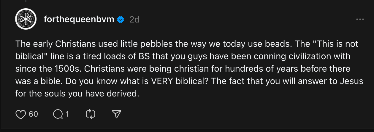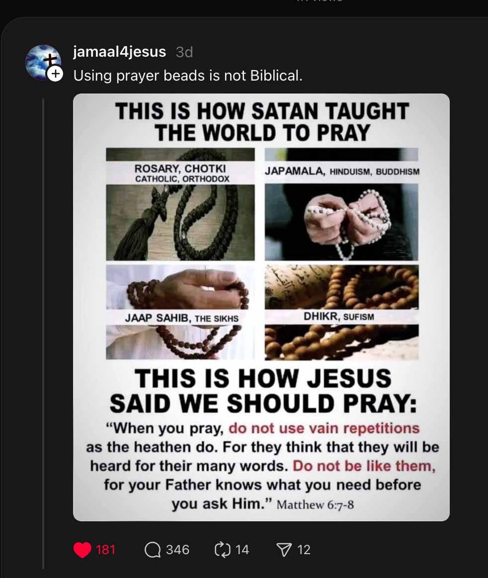 I came across a post on Threads the other day—one of those confidently wrong zingers that floats around Protestant corners of the internet. It claimed that “using prayer beads is not biblical,” accompanied by a smug graphic with the caption: “This is how Satan taught the world to pray.